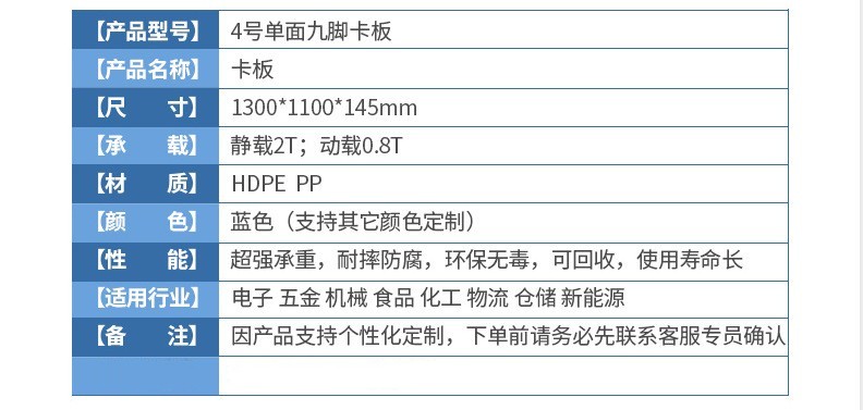 本店產(chǎn)品常規(guī)庫存為全新料藍色塑料托盤,周轉箱,周轉籮,化工桶,中空板材及部分高性價比黑色一次性出貨產(chǎn)品。如需要其他顏色請聯(lián)系客服對接處理。因產(chǎn)品規(guī)格較多,未能全部上至店鋪,如店中沒有您需要的規(guī)格尺寸也請聯(lián)系客服。希望能解決您的問題,我們竭誠為您服務!!!
